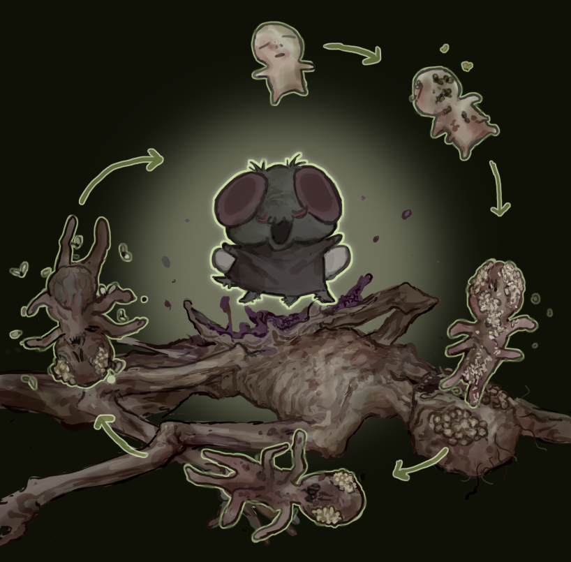 如你所见这是一只胖胖的很像苍蝇的生物,它们由因为瘟疫病死的人们腐烂的尸体中出生,是疫病神身体的一小部分们,这小小的信徒会在你家里除了嗡嗡祷告,就是吃腐烂的东西与空气中飘散的病毒,吃成这样胖胖的样子