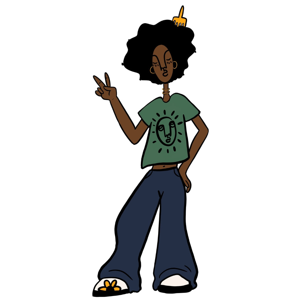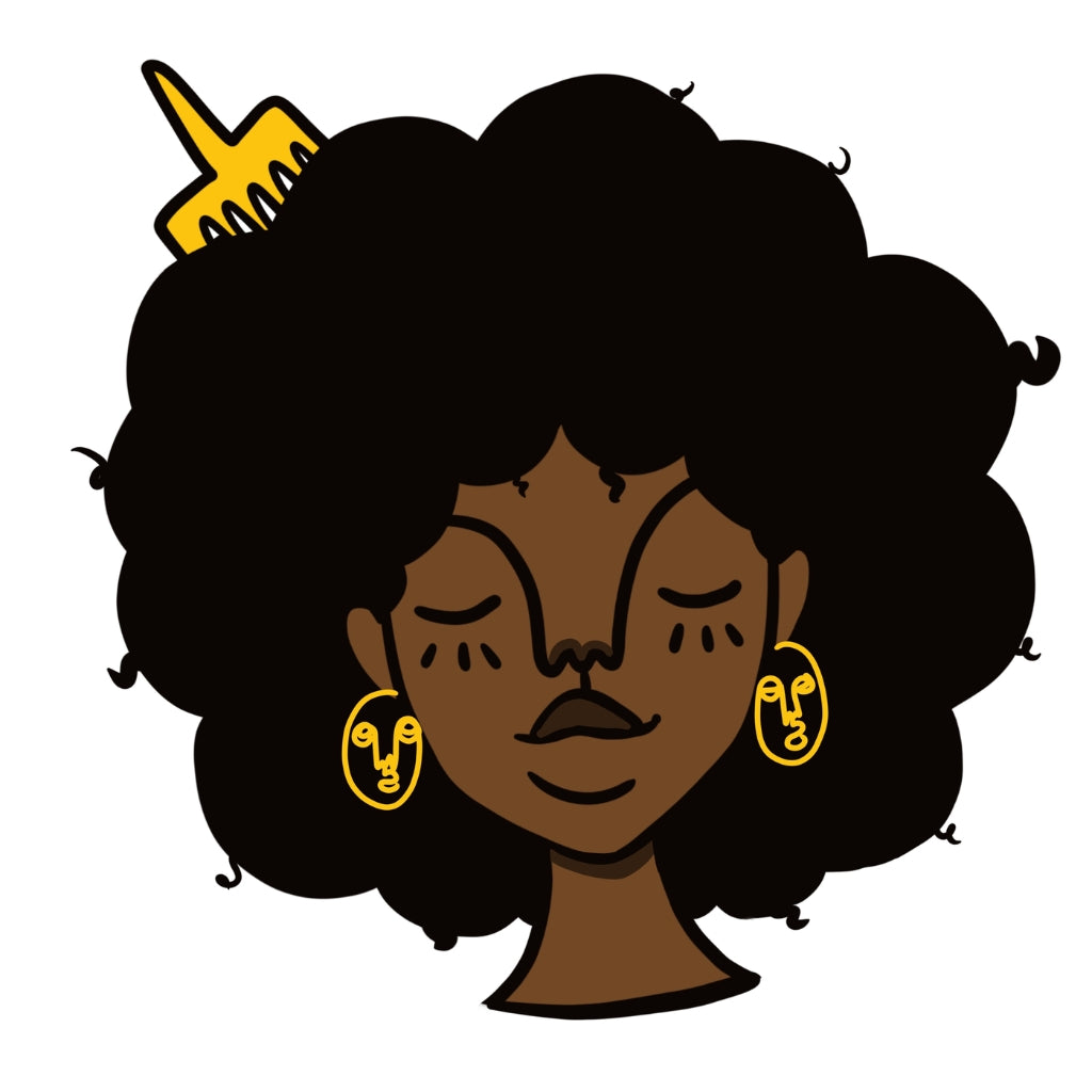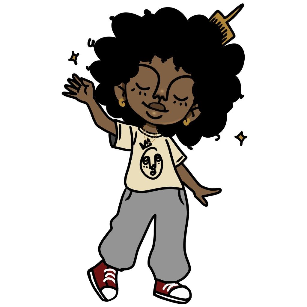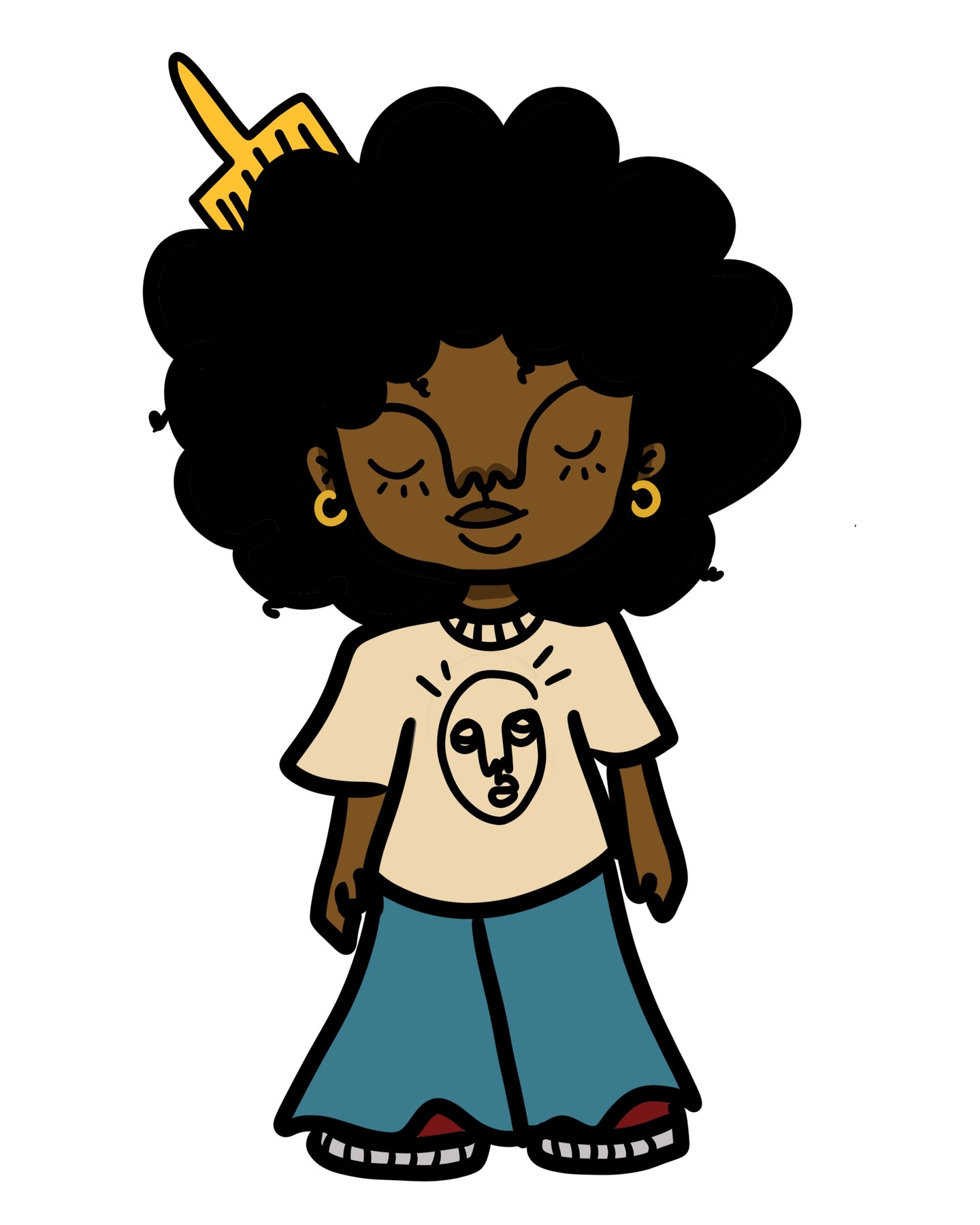Natty B is more than a character. She’s a reflection of how I see and celebrate everyday power, ease, and identity through my art. She’s been in my work for years, always showing up with a crown of coils, her gold Afro pick, and that effortlessly cool expression.